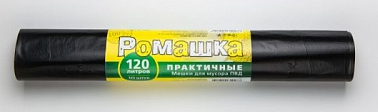 Мешки для мусора: 120л Ромашка Практичные ПВД, черные, 30мкм, 105*68см, 395гр, 10шт/рул, 20рул/уп