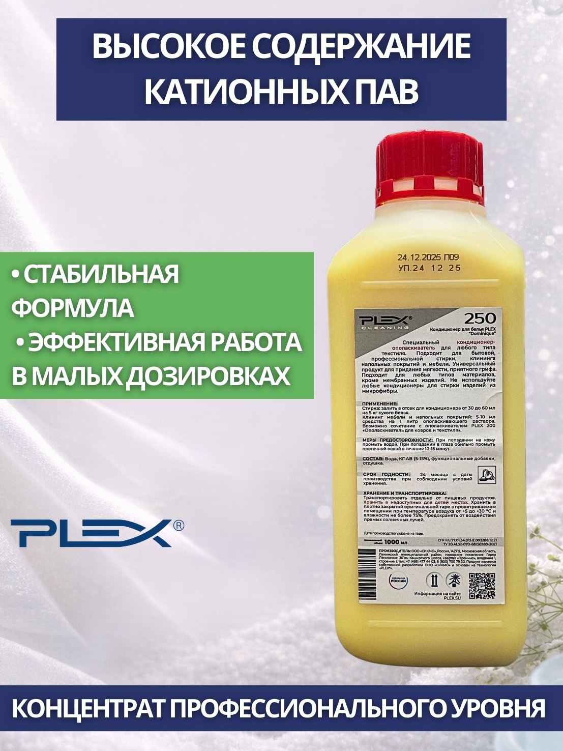 PLEX: 250 DOMINIQUE Кондиционер ополаскиватель с высоким содерж. катион.ПАВ Laundry&Cleaning, 1л