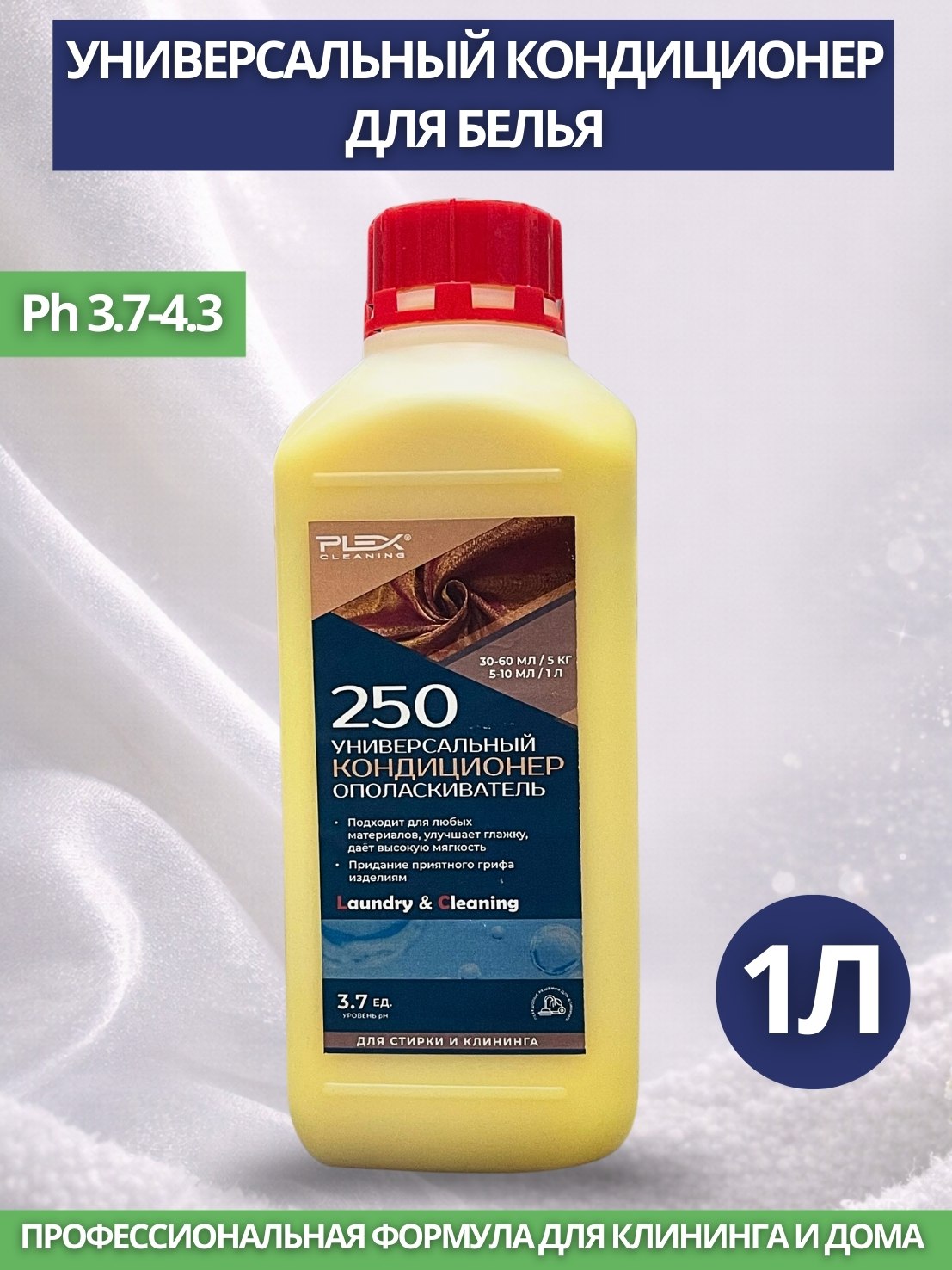 Специальный кондиционер- ополаскиватель для любого типа текстиля. Подходит для бытовой, профессиональной стирки, клининга напольных покрытий и мебели. Универсальный продукт для придания мягкости, приятного грифа.